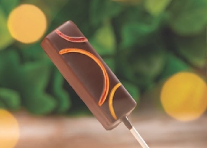 Ganache pop with flavors of passion fruit, orange, and guava covered in 65% dark chocolate