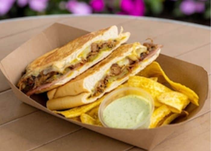 Pork lechon, ham, Swiss cheese, sweet pickles, and mustard on pressed Cuban bread served with plantain chips and avocado dip