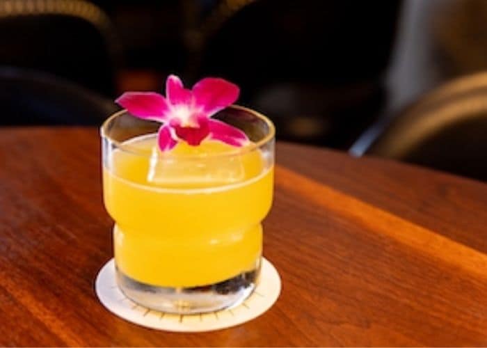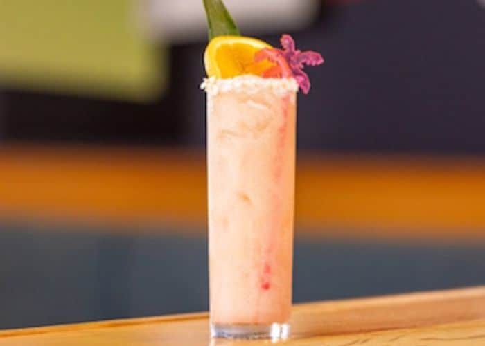 Patrón Silver Tequila, Malibu Coconut Rum, guava syrup, lemon juice, and simple syrup garnished with an edible flower