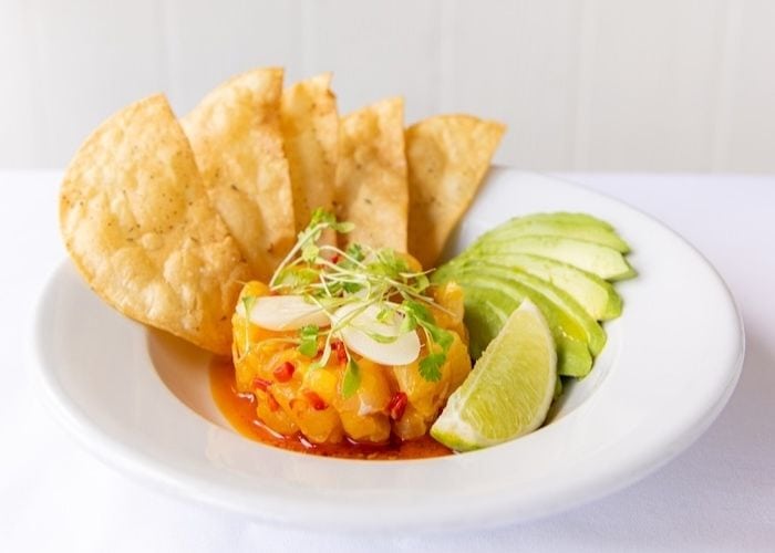Yellowtail tossed in a mango-lime salsa with red pepper, jalapeño, jícama, and cucumber topped with hearts of palm, micro cilantro, and chile oil served with tostadas and avocado