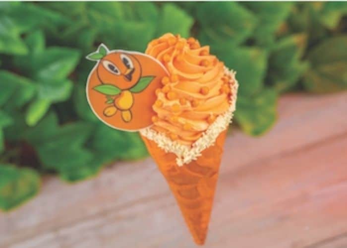 DOLE Whip Orange in an orange cone with sprinkles and a chocolate piece