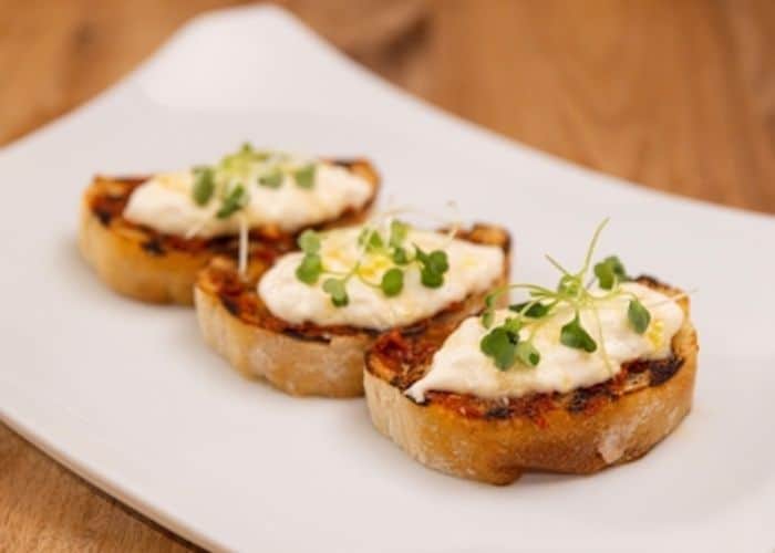 Bruschetta Calabrese: Grilled ciabatta topped with ‘Nduja and Florida-sourced Fioretta stracciatella, petal honey, and micro arugula (New)