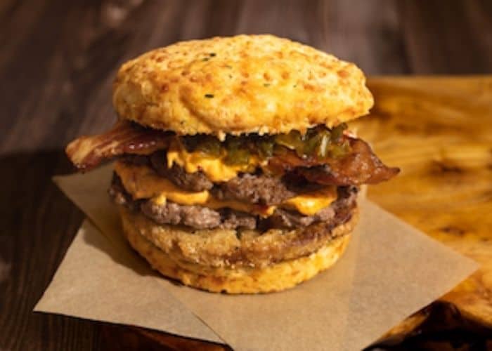 The Glowing Oak Burger: Two-pressed signature blend beef patties, pimento cheese, fried green tomato, bacon, and jalapeño jam on a cheddar-chive biscuit (New)