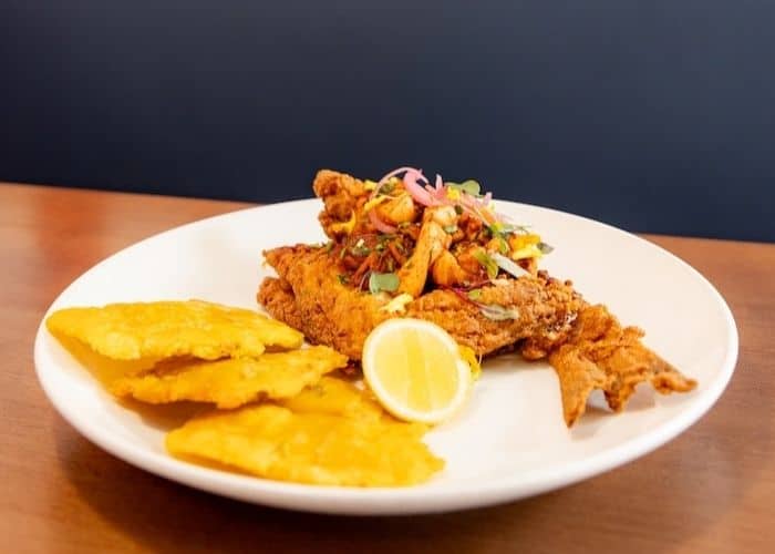 Crispy fried locally caught yellowtail snapper paired with a seafood mix of clams, mussels, octopus, calamari, and shrimp finished with pickled red onion and served with crispy tostones