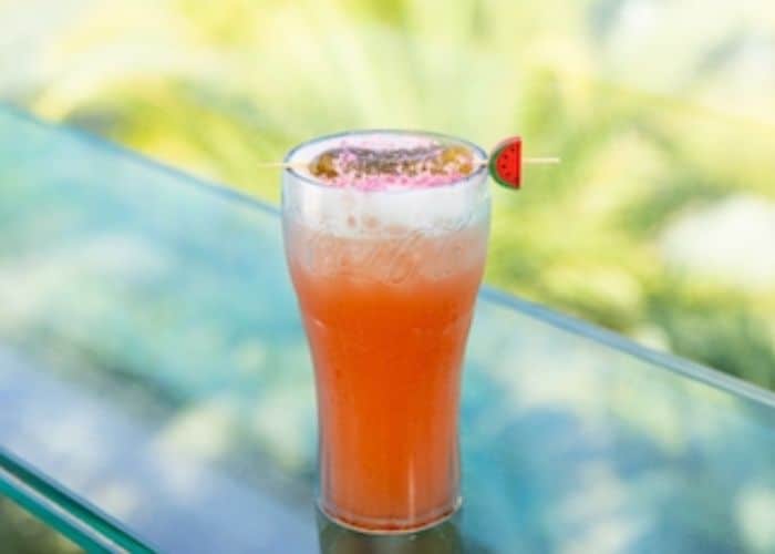 Minute Maid Lemonade, watermelon purée, and Chamoy sauce topped with Simply Lemonade and pickle juice foam (Non-alcoholic)