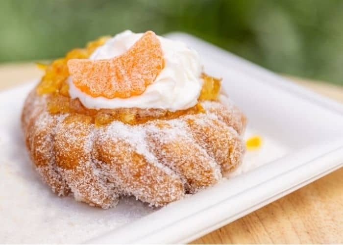 A churro donut shaken in sugar, topped with orange marmalade jelly, a dollop of whipped cream, and an edible orange gummy slice