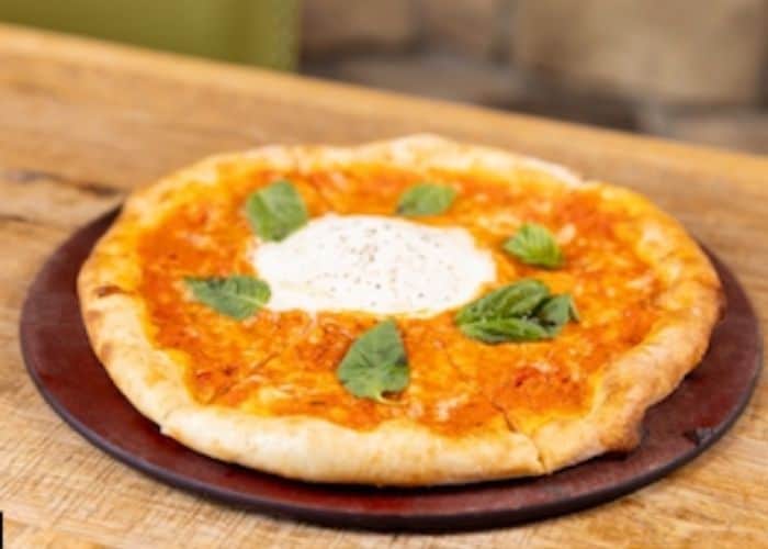 Pizza topped with locally sourced burrata from Dicuru Mozzarella, locally farmed basil from Orlando, & vodka sauce