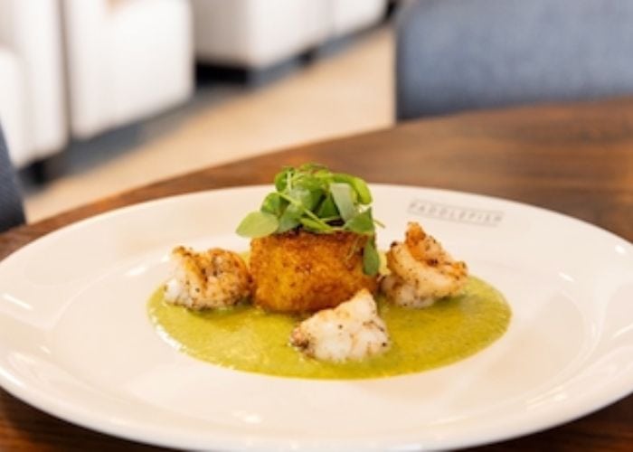 Florida Gulf Coast Shrimp served with a crispy rice grit cake and green chili sauce