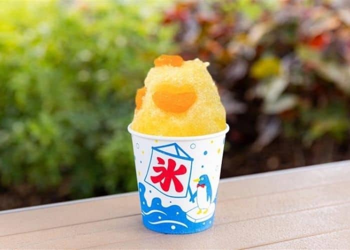 Japanese shaved ice topped with tangy lemon syrup and juicy mandarin orange slices