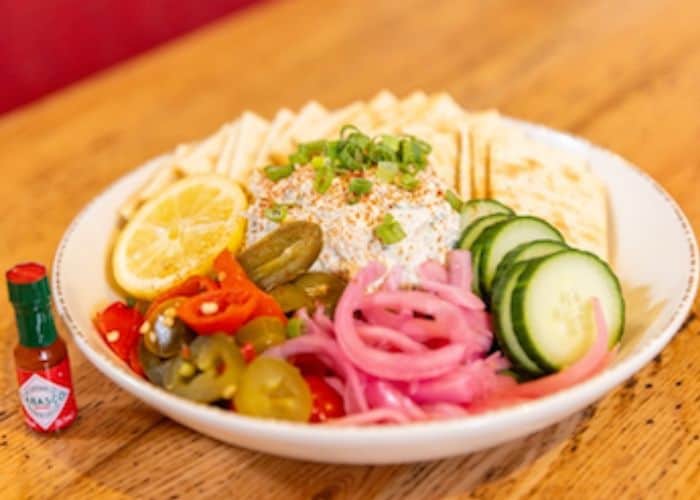 Mahi-mahi, wahoo, and white fish served with saltine crackers, tortilla chips, cucumbers, and jalapeños on the side